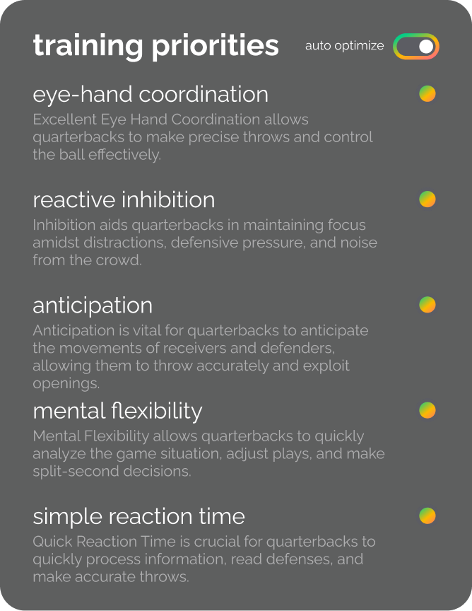 Reflexion’s proprietary Virtual CoachTM will auto-optimize your athlete’s training based on their sport, position, level, and current abilities. Training Priorities gives you the ability to take control where it matters and fine tune to match your unique needs.